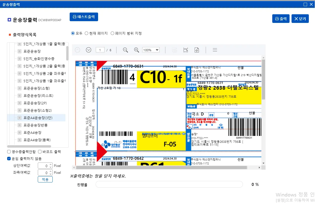 이 때 출력양식은 표준 A4 운송장(3단)으로 선택합니다.